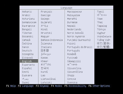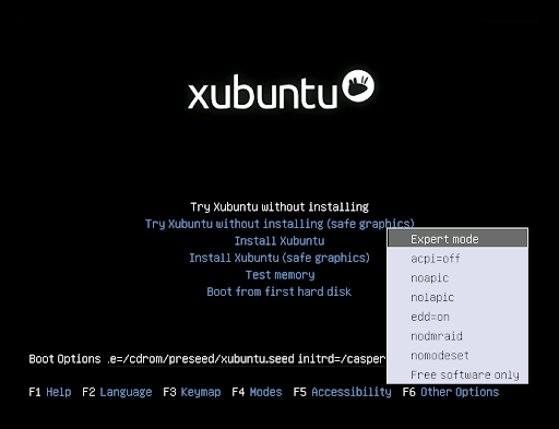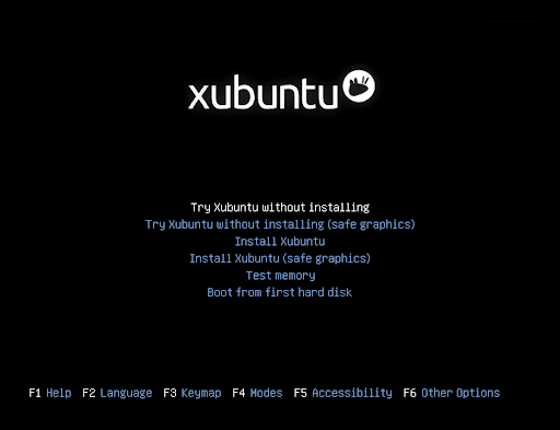 Once the bootable media starts, a blank screen will appear with a keyboard and accessibility icons. At this point, you have 5 seconds to press any key to access the installer boot menu, if you wish to. The boot menu will initially present a language selection menu, followed by a simple menu with options to install or try Xubuntu, test memory, boot from the hard disk, as well as other options accessible by pressing the F1 through F6 keys (for more information about the Fn keys options, click here).