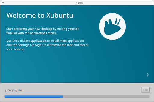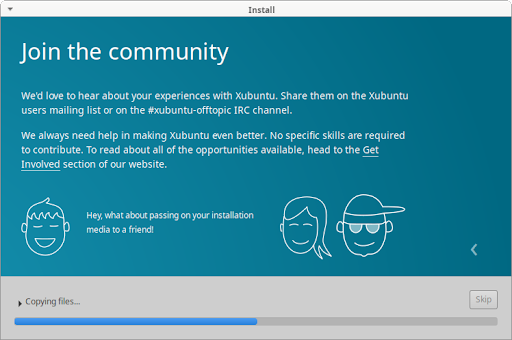 The installer will now begin installing Xubuntu in the background. While this is happening, installation slides will teach you a little bit more about Xubuntu, its support channels and community.