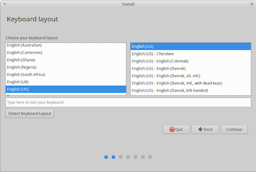 The next screen of the installer will be the Keyboard layout screen. There you can select your keyboard layout, if it wasn’t correctly detected. If you are unsure of your keyboard layout, you may press the Detect Keyboard Layout button to go through a brief configuration procedure and test that the layout works as intended in the keyboard test field. Click the Continue button to proceed.