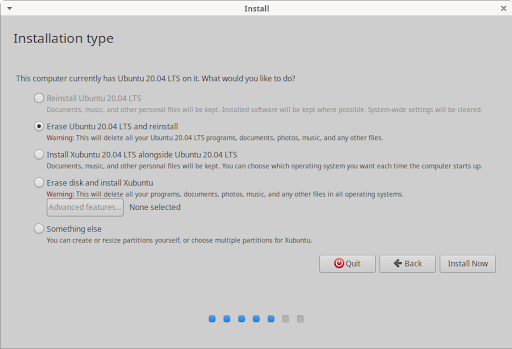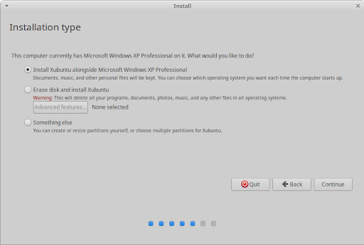 The next screen of the installer is the Installation type screen, which will vary in its list of installation and reinstallation options depending on which operating system(s) are currently on your hard disk. Regular users are recommended to choose either Erase disk and install Xubuntu, to completely wipe the disk and install Xubuntu as the only OS, or Install Xubuntu alongside [OS], to create a dual boot setup with Xubuntu and an existing operating system ([OS] is the existing OS, e.g. Microsoft Windows XP Professional in the screenshot). Advanced users can choose the Something else option, which gives them the ability to create, format, delete and assign partitions.