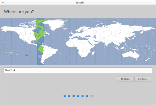 The next screen of the installer will be the Where are you? screen. There you can type the name of the town or city in the text field or click on the map to select your time zone. If you are connected to the internet, your location will be automatically detected. Click the button to proceed.