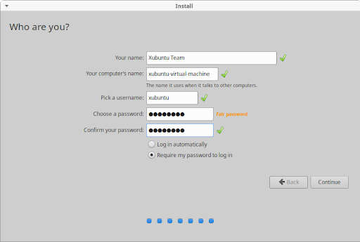 Next, enter a password, which will be evaluated, yielding a grade of 'short', 'weak', 'fair', 'good' or 'strong'. A strong password is one with a minimum of 8 characters, containing a mixture of uppercase letters, lowercase letters, numbers and symbols. It is highly recommended to use a strong password. You then have the option to select whether your computer will require you to type your password to log in when you first turn it on or have it log in automatically. You will always be required to type your password if you lock your computer or if the screen times out due to inactivity.