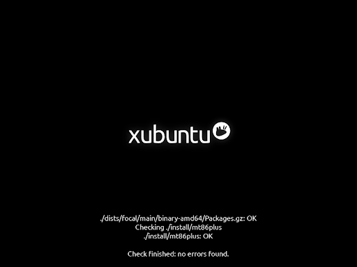 After the initial boot screen, releases of Xubuntu 20.04 and later default to checking the integrity of the install media, which can be skipped by pressing Ctrl+C. This check is important as it is common for corrupted installation media to cause failed installations.