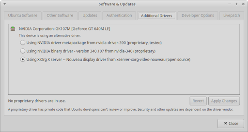 To view and manage which proprietary devices are used on your system, you can open Additional Drivers, which will open the Software & Updates settings dialog to the Additional Drivers tab.