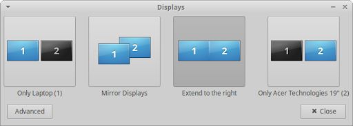 The Advanced tab provides even more multi-monitor options, including the option to save a display configuration so that it can be easily applied at a later time. When the Configure new displays when connected option is toggled, the below Displays mini dialog will appear, providing the most common display configurations, as well as any user-saved display configurations. The keyboard shortcut Super + P will open this dialog in a multi-monitor setup and clicking the ‘Advanced’ button opens the Display settings dialog.