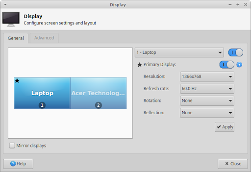 On the General tab, you can change the screen’s resolution, refresh rate, rotation and reflection in the various drop-down lists. Click the Apply button to try out the changes and a confirmation dialog will appear to let you confirm or reject the changes. The previous configuration will be restored if you don’t confirm or reject the changes within 10 seconds.