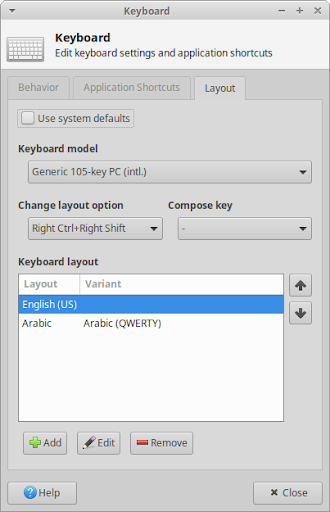 The Behavior tab provides options for the Num Lock key state, key repeat speed and delay, as well as text cursor blinking speed. The Application Shortcuts tab allows you to manage the keyboard shortcuts for the launching of applications. The Layout tab provides options to select the keyboard model and manage keyboard languages and layouts. With multiple keyboard layouts present, you also have the option to set a keyboard shortcut to cycle through the keyboard layouts.