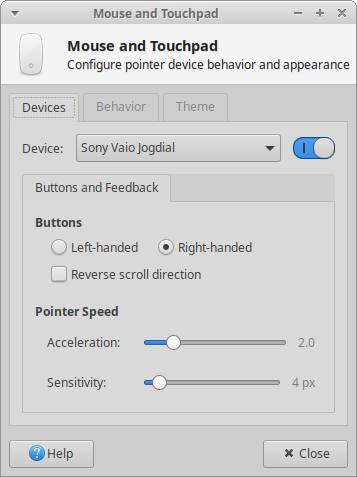 The Devices tab allows you to select each individual device from the Device drop-down list and adjust their individual options. This includes whether it is enabled, as well as its button arrangement, scroll direction, pointer speed, and trackpad sensitivity. If the selected device is a trackpad that is using the Synaptics driver, a Touchpad tab will appear next to the Buttons and Feedback tab with options to enable and disable the trackpad while typing, tap to click, as well as edge and two-finger scrolling. A Tablet tab will appear when a device is detected to be using the Wacom driver.