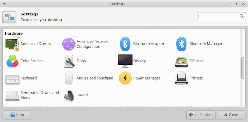 Xubuntu configures your hardware automatically with optimal defaults, but there may be occasions when you need to make changes to these hardware settings. This section provides information on tools to configure them, which can be accessed from the Hardware category of the , the Settings category of the (Ctrl + Escape), and in the Application Finder (Alt + F3).